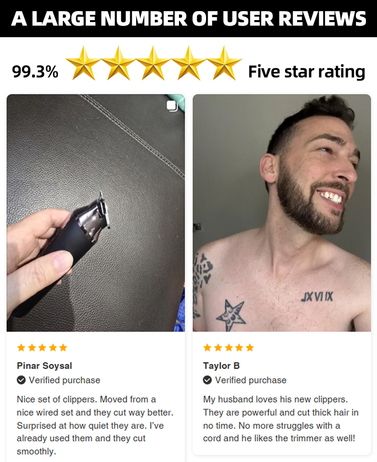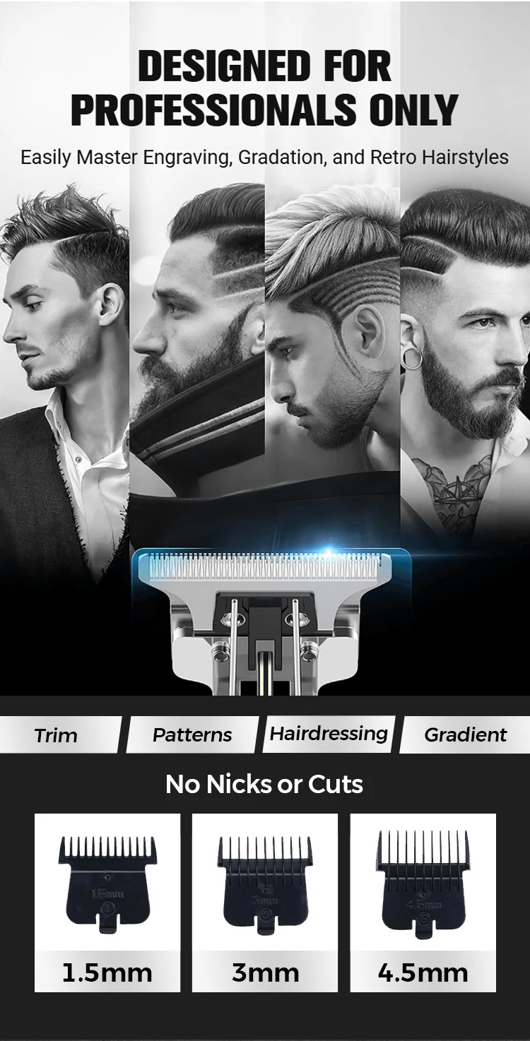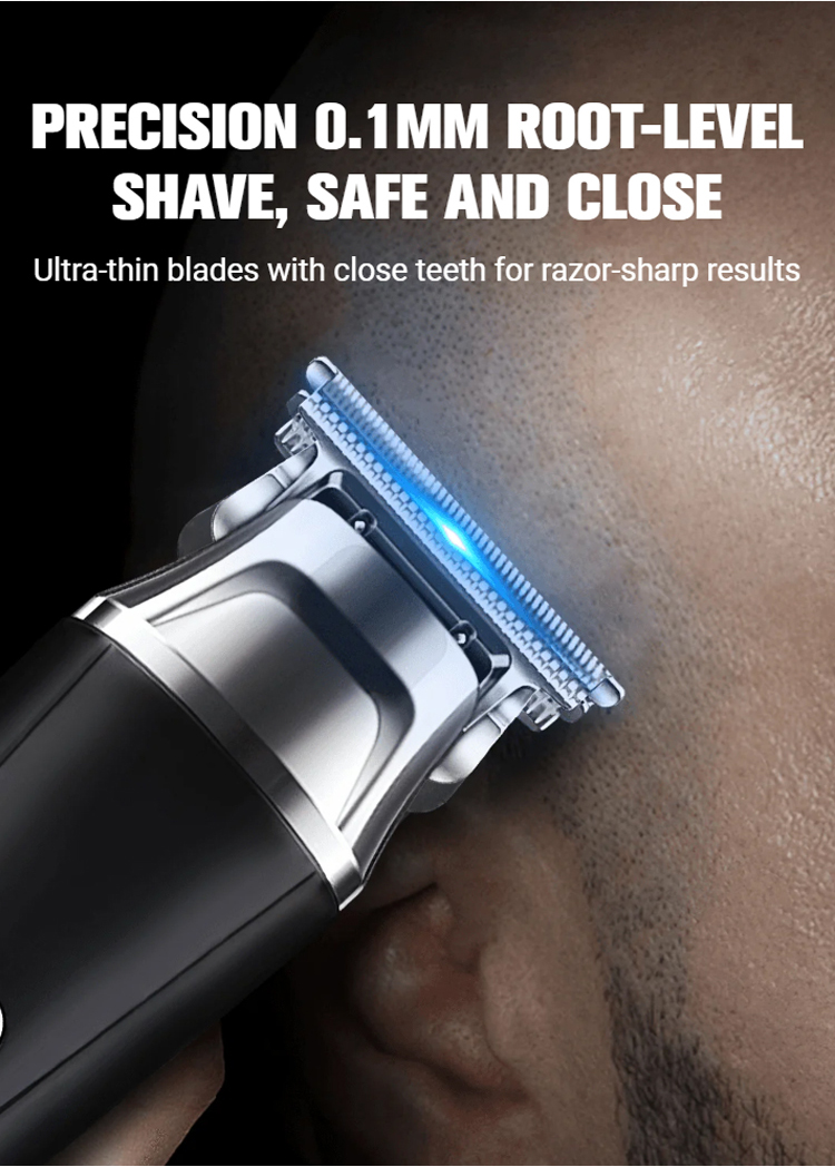 The core configuration has been completely upgraded! The 7000RPM high-speed motor delivers powerful yet gentle hair cutting without pulling. Its 0.1mm short tooth pitch design ensures precise cutting for both fine and coarse hair, allowing you to create a neat hairstyle in just 3 minutes. Effortlessly achieve gradient, sculpted, and retro styles, transforming you into a professional hairdresser at home. The high-hardness steel blade is sharp, durable, and resistant to dulling. It conforms to the scalp's 360° contour, preventing hair snagging and scratches, ensuring a safe and smooth cut.