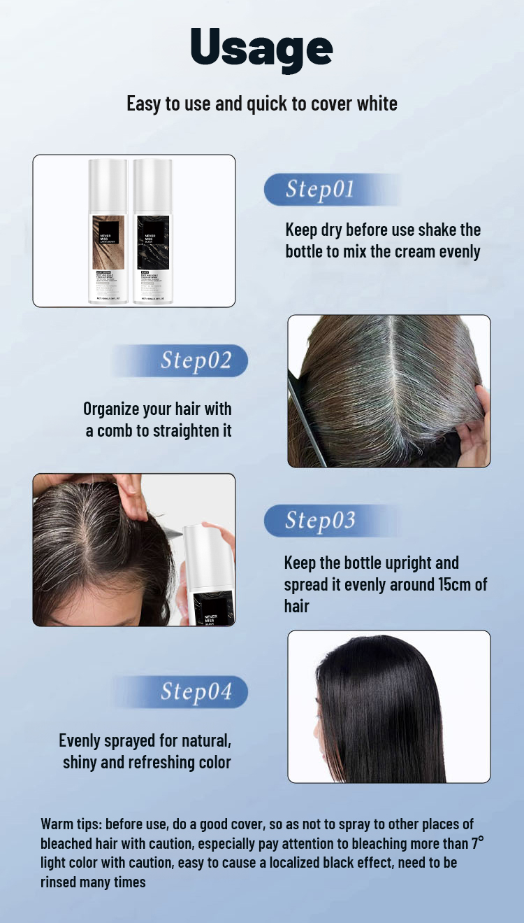 💁♀️A breakthrough from 17 years of research by German hair experts! This product combines color correction and gray hair coverage with scalp nourishment, specifically targeting scattered gray hairs, new gray hairs, and gray hairs at the temples. It's safe, non-irritating to the scalp, and won't damage hair strands. 👍A light spray easily covers gray hair, providing natural and long-lasting color, and is waterproof, sweatproof, and non-greasy.
