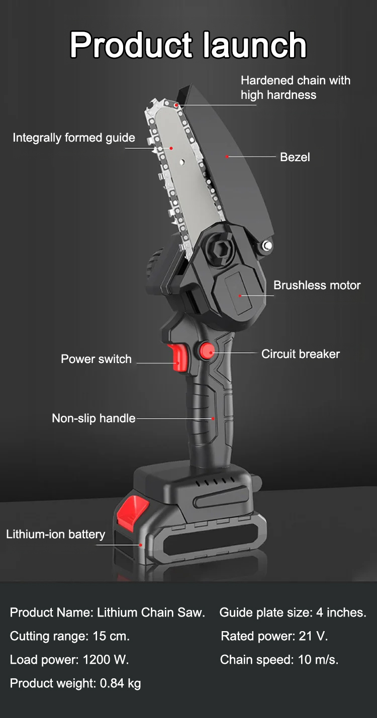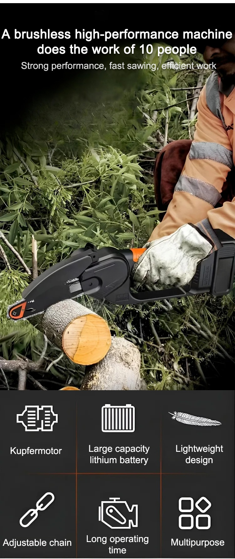🔥German-made brushless lithium battery single-hand saw, 1200W load power, 10m/s chain speed, 💯powerful performance comparable to professional large chainsaws, easily cutting hardwood, thick branches, and bamboo. One machine is equivalent to 10 workers! 👍Saws thick branches in just 3 seconds! Large capacity, long battery life, lightweight design, even women can operate it with one hand.