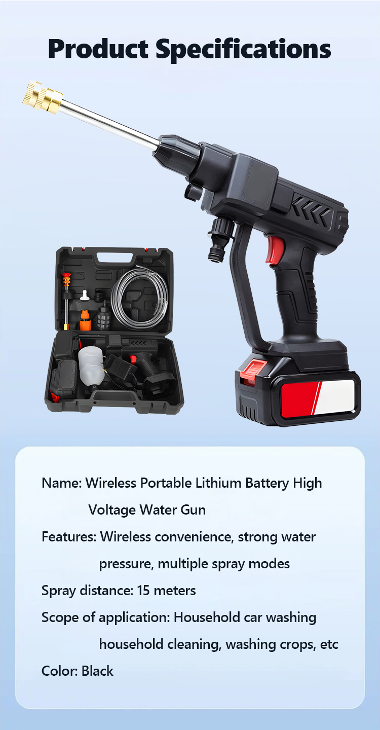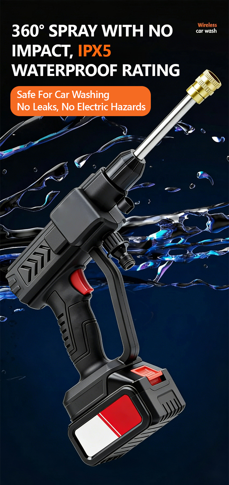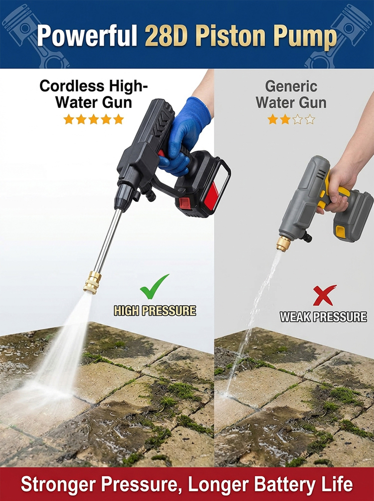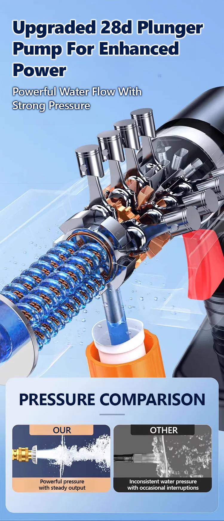 Equipped with an upgraded 28D high-pressure piston pump, it delivers a powerful water jet up to 15 meters high in high-pressure mode, with stable and uninterrupted pressure. It effectively cleans mud, sand, bird droppings, tree sap, oil stains on wheels, and even stubborn stains on the ground with a single rinse. It also features upgraded long battery life, fast charging, and overheat protection for safer and more durable use.
